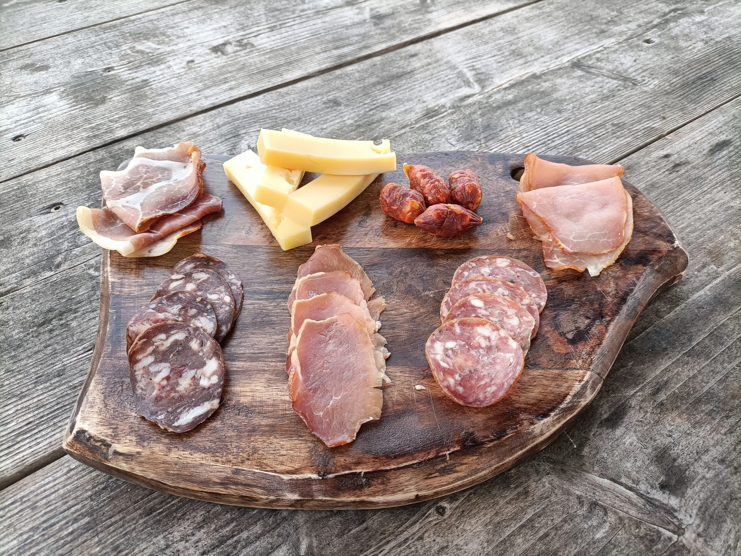 4 salamis maison, 2 jambons cru, 2 bacons, 4 salamis gibier, 4 filets mignon, 4 fromages et 4 grignotins chorizo